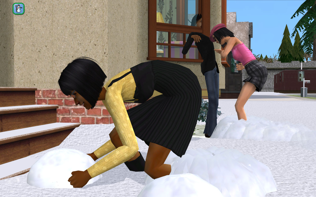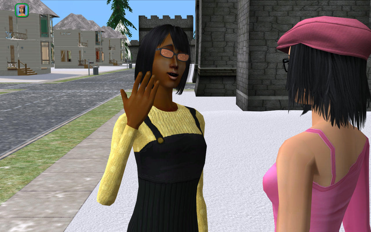 Fun in the snow with Mercutio and Pals. That’s Chaz’s girlfriend Heather Vu, a dormie. She looks a little like Crystal Vu and they’ve got the same name, so I made them sisters.
