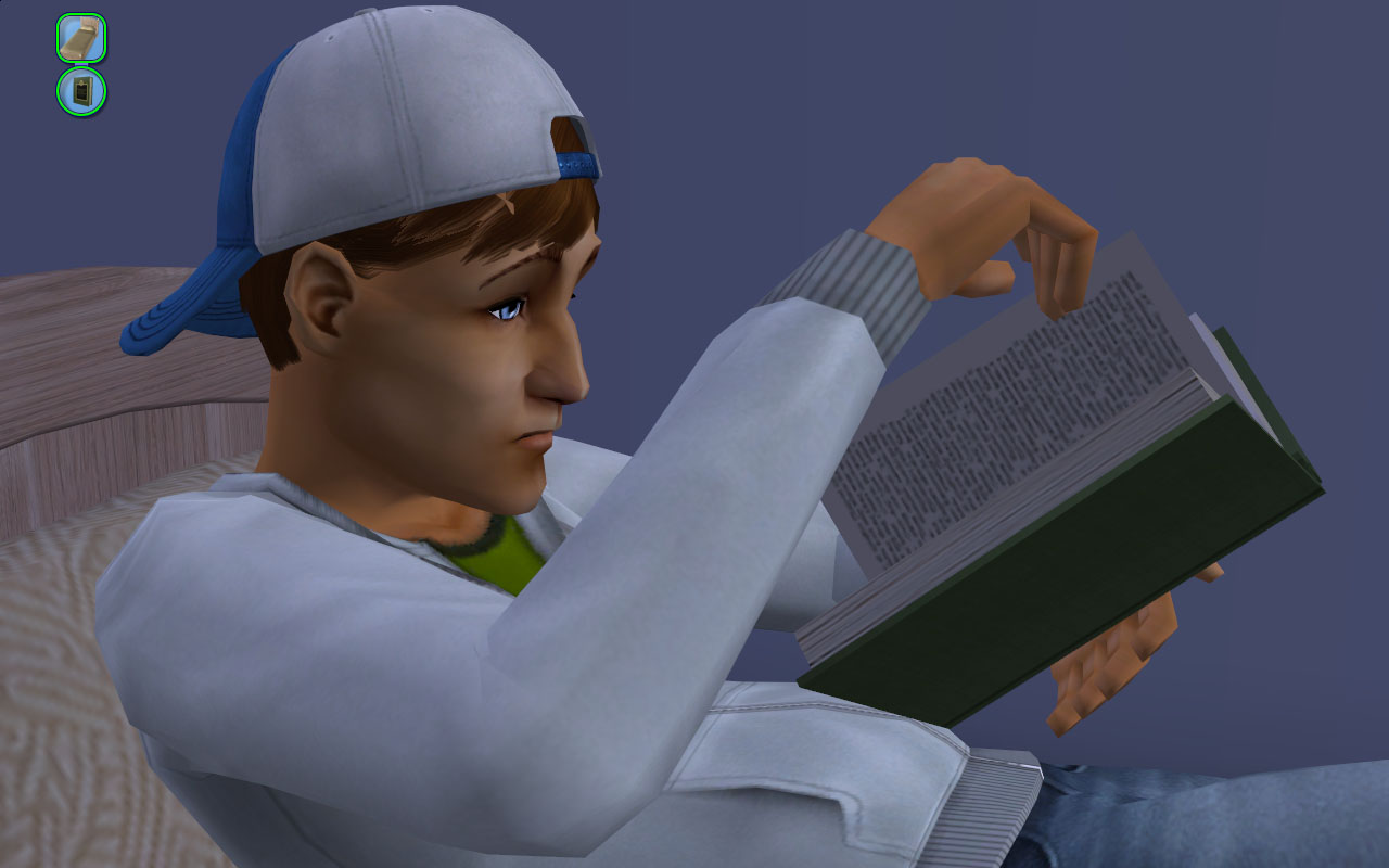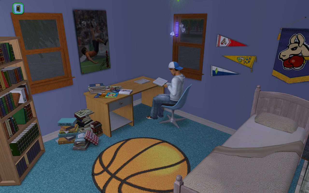 Despite his sporty appearance, Max’s bio (and behavior!) says he enjoys cooking and reading, so I gave him plenty of books (he’s sloppy so most of them are in a big pile on the floor). There’s a few cookery books tucked away in there! I also switched his OTH to cuisine and gave him a family secondary, since he rolled a want to learn how to make comfort soup.
