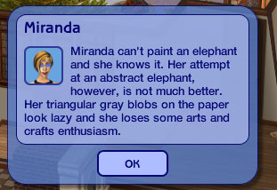 Here’s what Miranda’s been up to. Flirting with Ripp (why does everyone in this neighborhood know Ripp, I’ll have to download that mod that improves the “randomness” of sims brought home), improving her art, nearly flunking out of school, reaching the top of her career, and finally letting her Dad teach her to study. (Only some pictured, because this was a long round and my game crashed twice during it.)