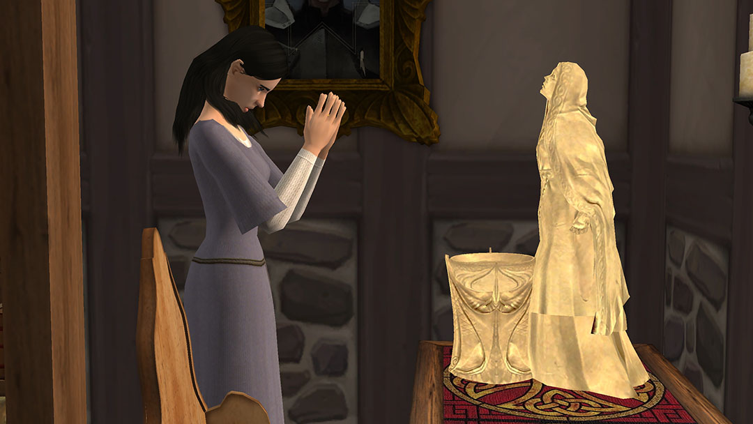 The little idol is part of the Sun & Moon metalsmithing set and I got so excited when I realised sims would autonomously pray to it! I gotta put some of these in the church itself.
