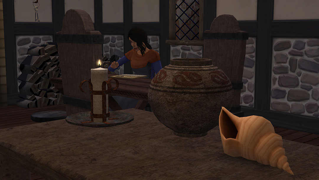 Despite his high status in society, I imagine Sir Roberte being bad with money, so it’s nothing too fancy. (He is clumsy and a loser, according to his traits. Maybe the type of fortune sim who is mainly into spending rather than saving.) It’s certainly nicer than the little fishing shack, though! And she gets it all to herself :D