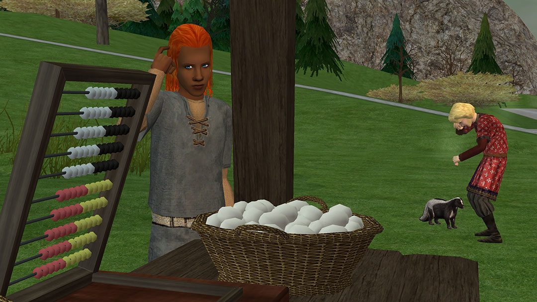 His life is pretty simple - collect eggs each morning, slaughter a chicken, and sell those goods (along with anything else he happens to aquire from scavenging in the forrest). Usually he’s all sold out and ready to close by the noon, which leaves him with plenty of free time.
