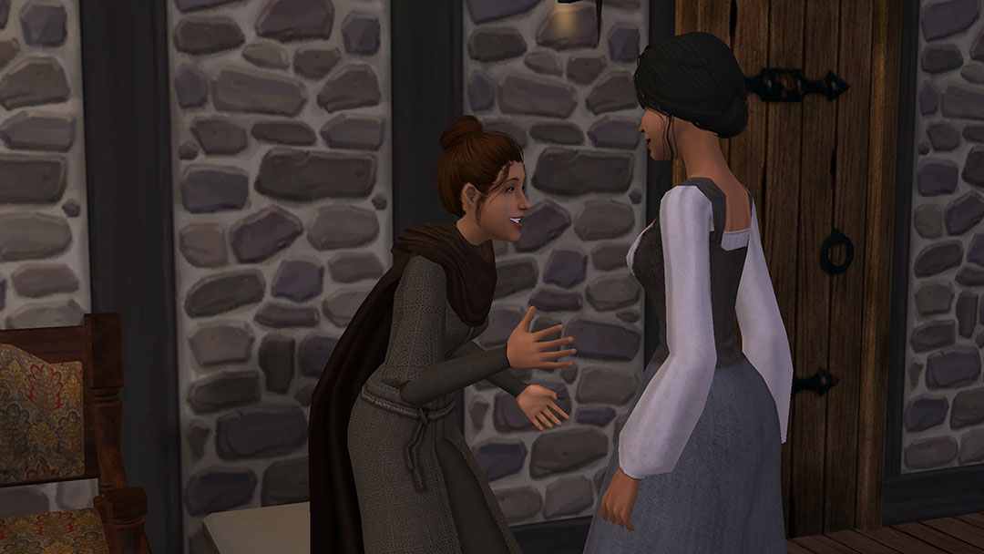 Hilda and Emily are still fast friends, catching each other up on the local gossip. Poor Hilda is in aspiration failure still, but I have to admit I love the default replacement making her go full Hamlet with it. Whose skull even is that? :/