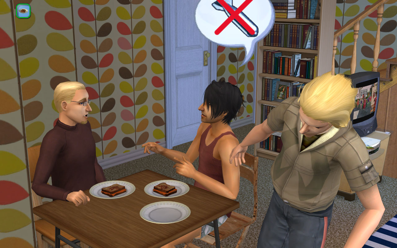 Despite his sporty appearance, Max’s bio (and behavior!) says he enjoys cooking and reading, so I gave him plenty of books (he’s sloppy so most of them are in a big pile on the floor). There’s a few cookery books tucked away in there! I also switched his OTH to cuisine and gave him a family secondary, since he rolled a want to learn how to make comfort soup.