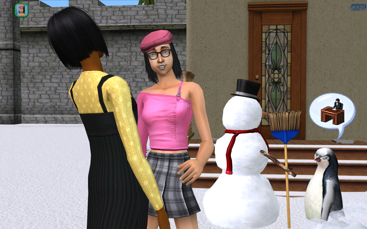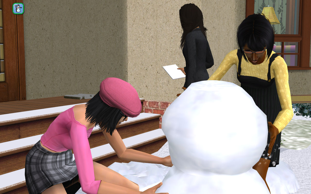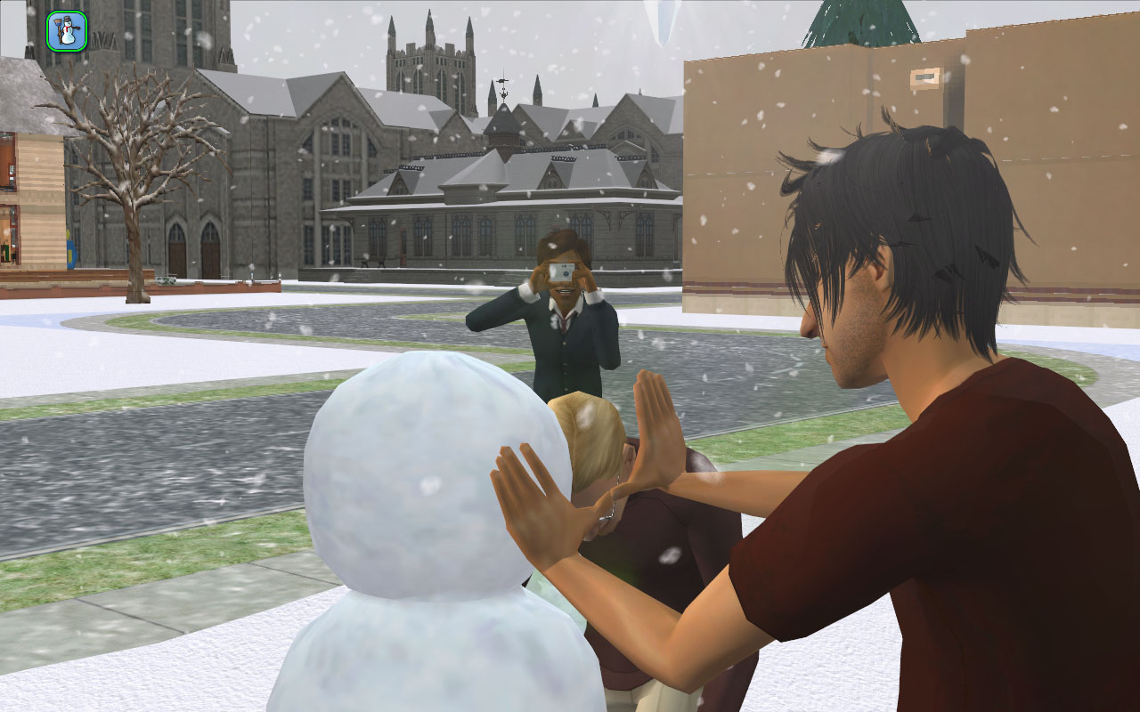 Fun in the snow with Mercutio and Pals. That’s Chaz’s girlfriend Heather Vu, a dormie. She looks a little like Crystal Vu and they’ve got the same name, so I made them sisters.