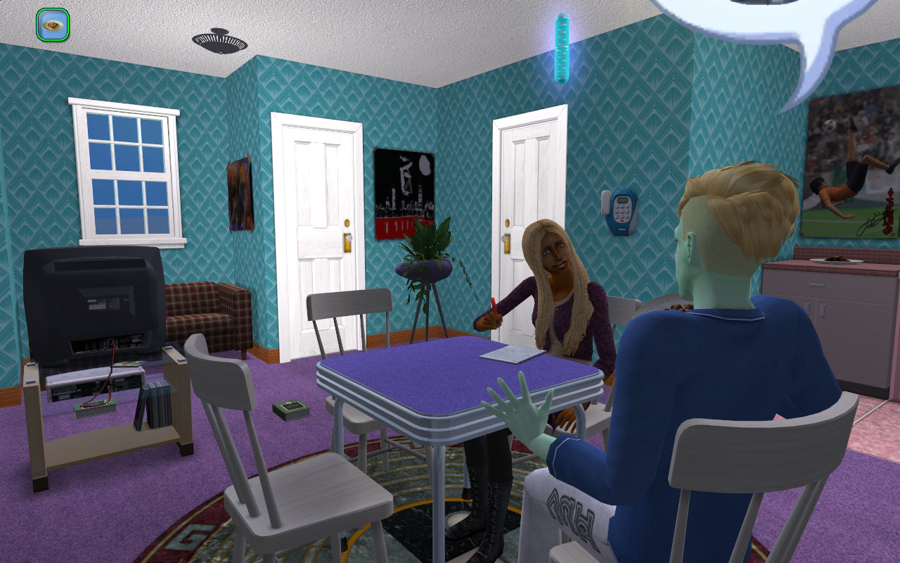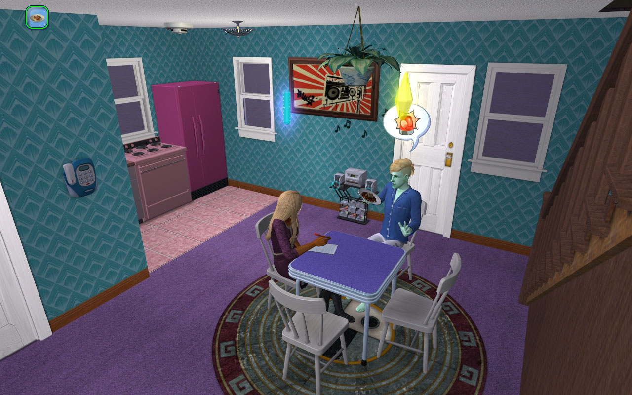 I don’t remember if I’ve posted pictures of it before, but I just love the interior of Johnny and Ophelia’s place. It’s amazing how much more pumped I am to play a household when it has funky wallpaper.