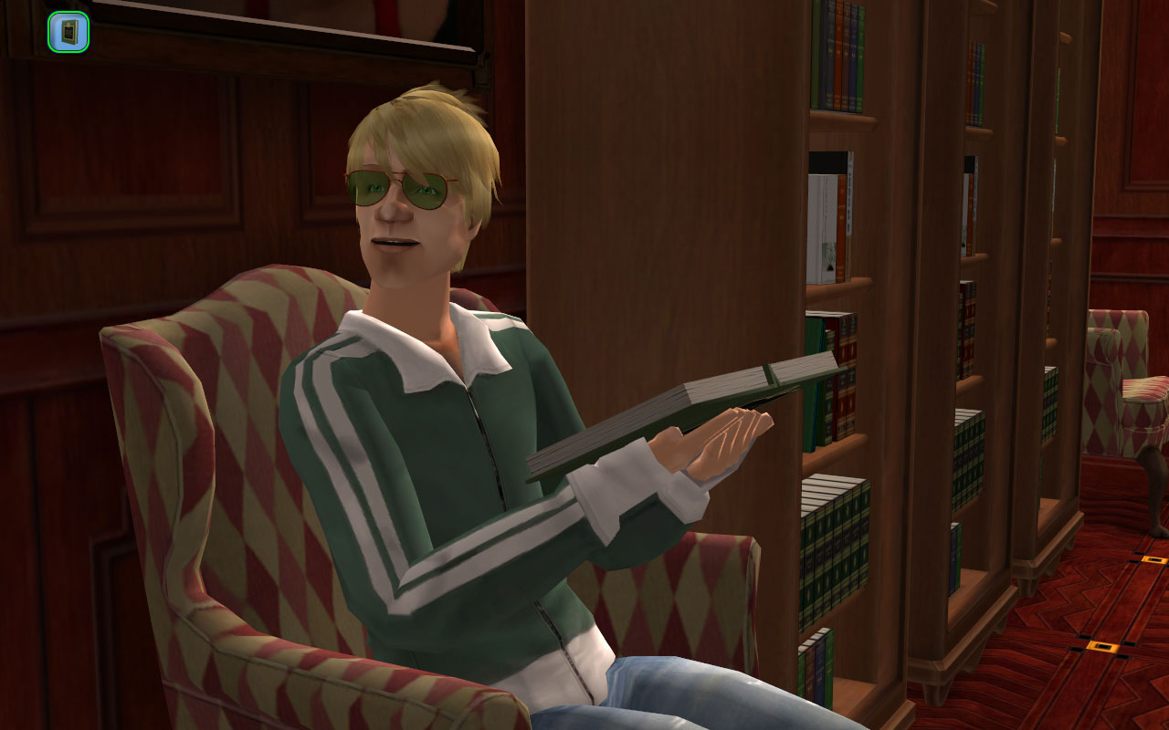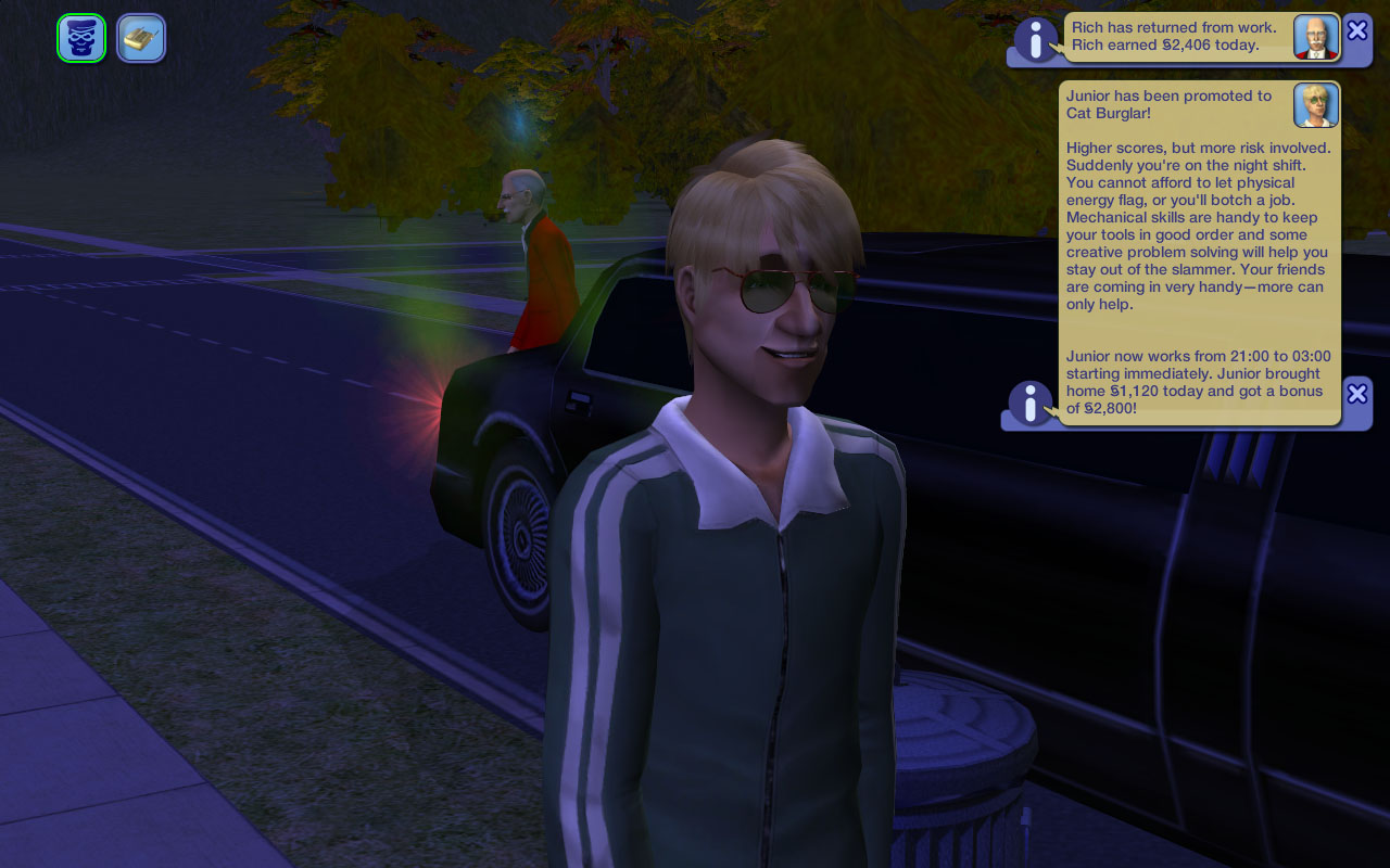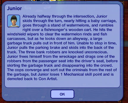 Junior’s unusually focused on his career, perhaps because this Junior actually has the Criminal Mastermind LTW. (I can’t remember if I picked it out for him or not, but he’s keeping it.) He’s still Junior, though, and makes a lot of blunders.