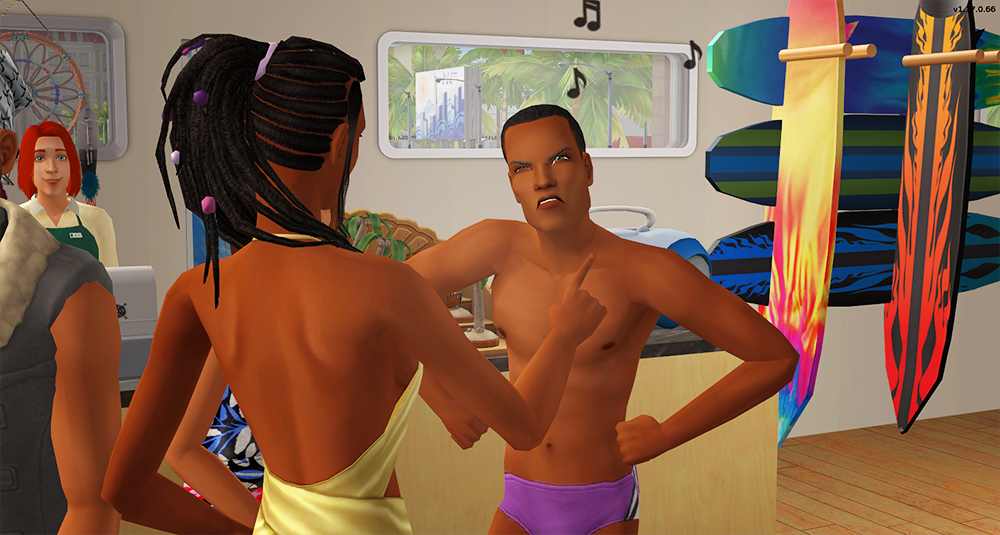 Layla: Hahaha, in a friggin’ surf shop? I’m wearing a shirt! Kinda. More than can be said for, say, that guy…